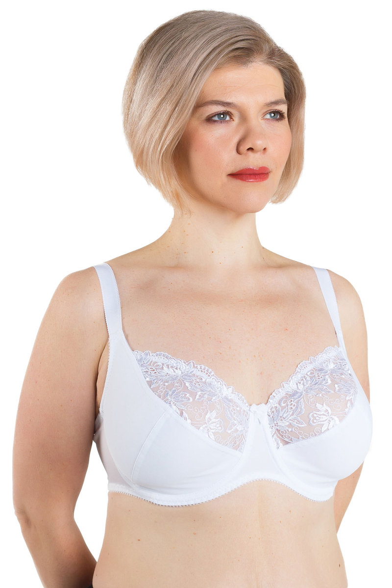 Классический бюстгальтер для повседневной носки, мягкая чашка, верхняя часть чашки - вышитая сетка, чашка на подкладке из х/б трикотажного полотна, на каркасах. Смещенный шов чашки предназначен для того, чтобы не раздражать грудь с повышенной чувствительностью.
