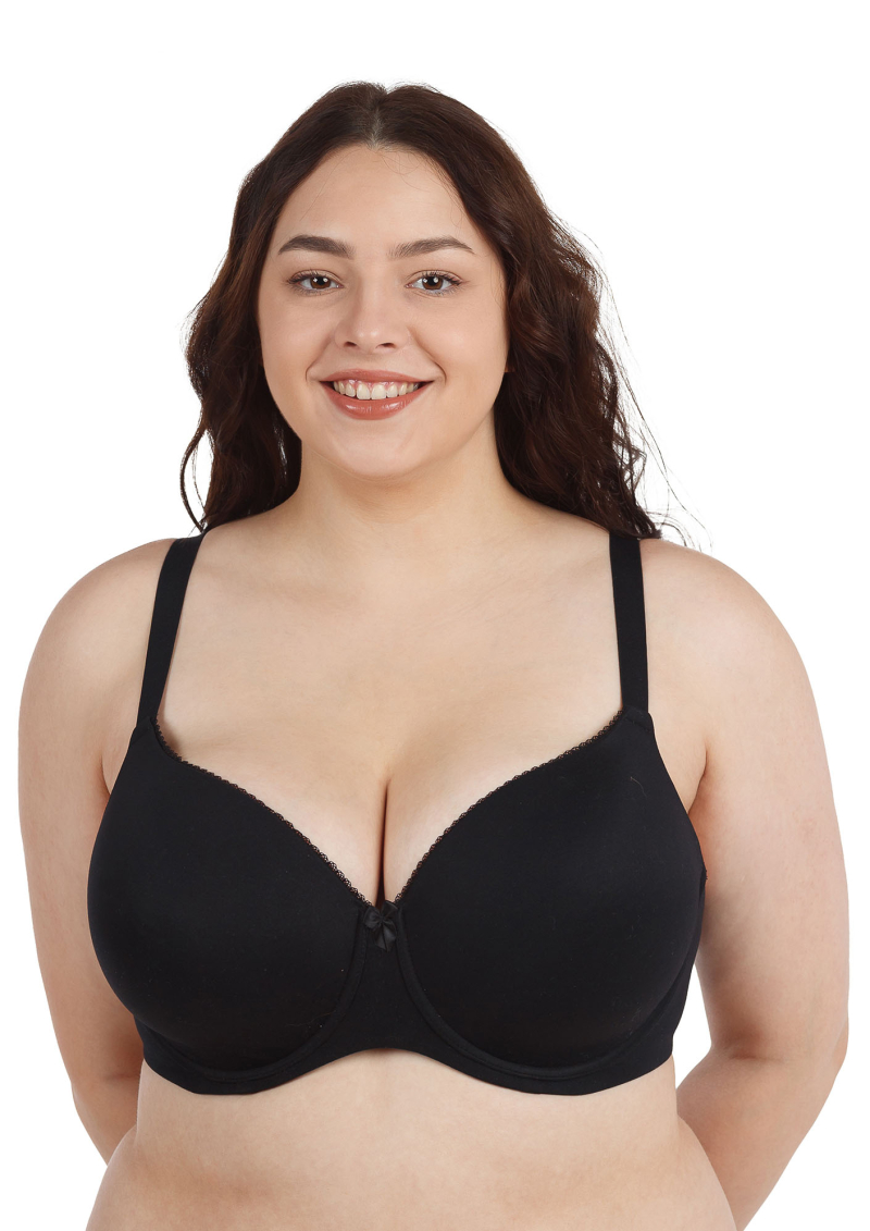 Удобный бюстгальтер на каждый день, гладкая чашка незаметна под одеждой. Выполнен из микрофибры с формованной поролоновой чашкой, на каркасах. Верхние срезы чашек украшены плетёным кружевом.