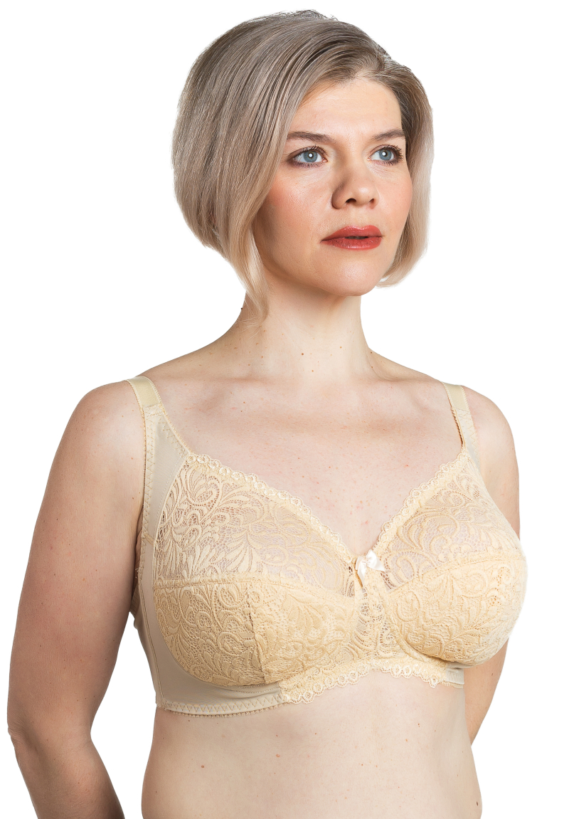 Классический бюстгальтер на каждый день, кружевная чашка, нижняя часть чашки на поролоне, дублированная х/б полотном, без каркасов. Для дополнительного комфорта в носке боковые части пояса усилены стержнями. Эта модель бюстгальтера может быть выполнена с применением эластичного кружева другого артикула для улучшения внешнего вида.