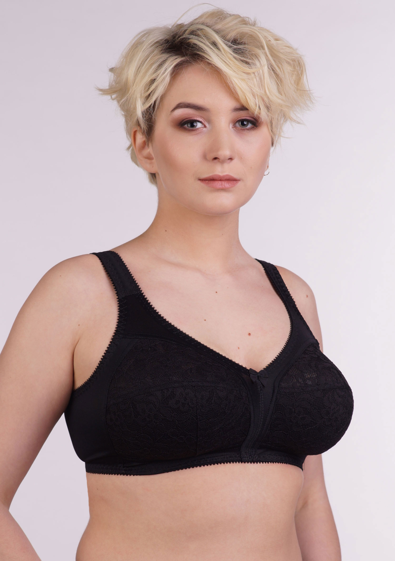 Удобный бюстгальтер на каждый день с кружевной мягкой чашкой на хлопковой подкладке, без каркасов, широкая боковая часть пояса и усиленная бретель хорошо держат грудь и снижают нагрузку на плечевой пояс.