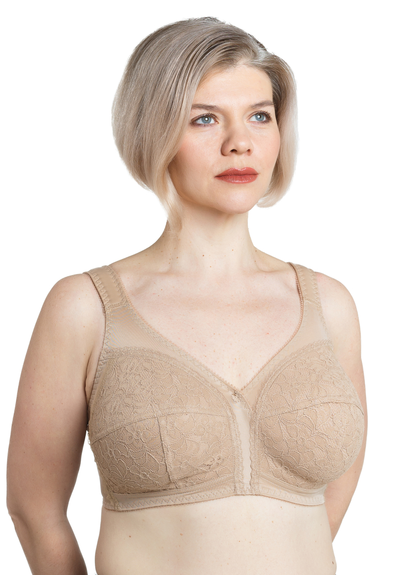 Удобный бюстгальтер на каждый день с кружевной мягкой чашкой на хлопковой подкладке, широкая боковая часть пояса и усиленная бретель хорошо держат грудь и снижают нагрузку на плечевой пояс.